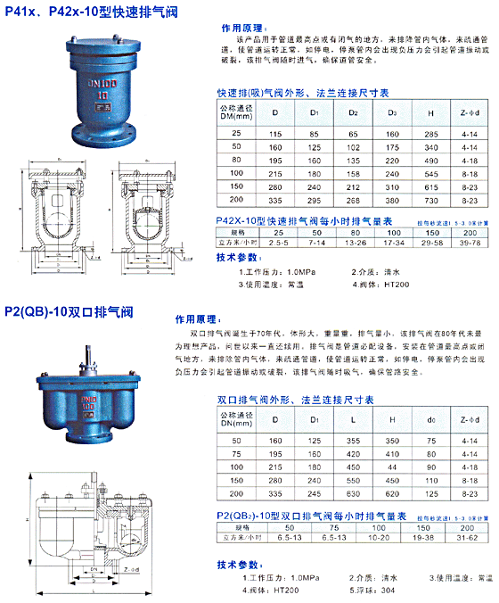c65bP41X、P42X、P2(QB)快速排氣閥/雙口排氣閥誕生于70年代,體形大,重量重,排氣量小,該排氣閥在80年代末為理想產(chǎn)品,問世以來一直還續(xù)用。排氣閥是管道必配設(shè)備,安裝在管道高點或閉氣地方,來排除管內(nèi)氣體,來疏通管道,使管道運轉(zhuǎn)正常,保證排氣時絕不排水.只要系統(tǒng)有壓力,排氣閥就會連續(xù)不斷的排氣
