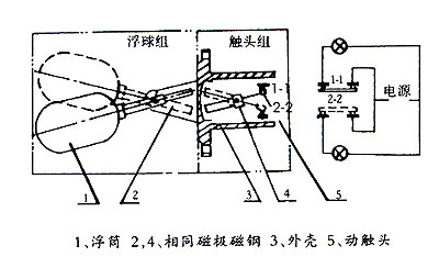 當被測液位升高或降低時,浮球1隨之升降,使其端部的磁鋼2上、下擺動,通過磁力作用,推斥安裝在外殼3內相同磁極的磁鋼4上、下擺動,其另一端的動觸點5便在靜觸頭1-1及2-2間連通或斷開。