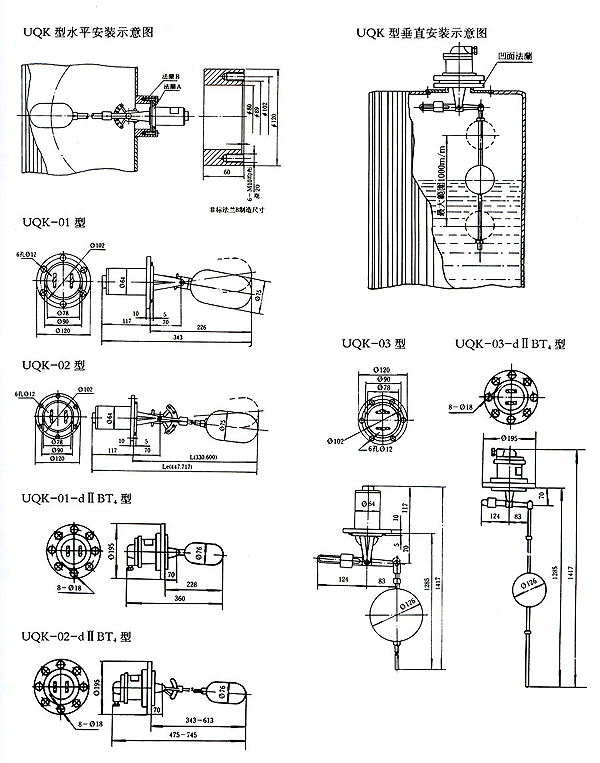 UQK型浮球液位控制器適用于對各種容器內液體的液位控制,當液位到達上、下切換值時,控制器觸點發出通斷開關式信號。