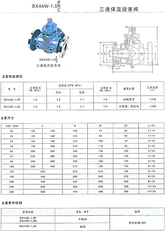 BX44W三通保溫旋塞閥又三通稱夾套旋塞閥,是在普通三通旋塞閥的基礎上,在旋塞閥閥體外部焊裝金屬夾套。在閥體兩測裝有夾套接口,可涵入蒸氣或其它過熱氣體,以保護閥內介質不會在常溫下凝固或結晶。同一規格口徑的情況下,保溫旋塞閥的連接尺寸要比普通旋塞閥大一到兩個規格。BX44W三通保溫旋塞閥主要用于石油、化工、冶金、制藥等各類系統。