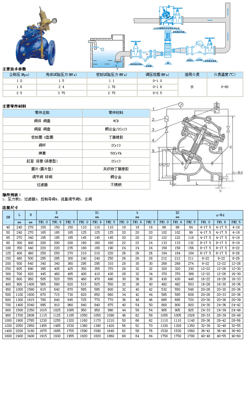 工作原理當(dāng)管道從進(jìn)水端給水時(shí),水流過針閥進(jìn)入主閥控制室,出口壓力通過導(dǎo)管作用到導(dǎo)閥上,當(dāng)出口壓力高于導(dǎo)閥設(shè)定值時(shí),導(dǎo)閥關(guān)閉,控制室停止排水,此時(shí)主閥控制室內(nèi)壓力升高并關(guān)閉主閥,出口壓力不再升高。當(dāng)出口壓力降到導(dǎo)閥設(shè)定壓力時(shí)導(dǎo)閥開啟,控制室向下游排水。由于導(dǎo)閥的排水量大于針閥的進(jìn)水量,主閥控制室壓力下降,進(jìn)口壓力使主閥開啟。穩(wěn)定狀態(tài)下,控制室進(jìn)水、排水相同,開度不變,出口壓力不變。調(diào)節(jié)導(dǎo)閥彈簧即可設(shè)定出口壓力。