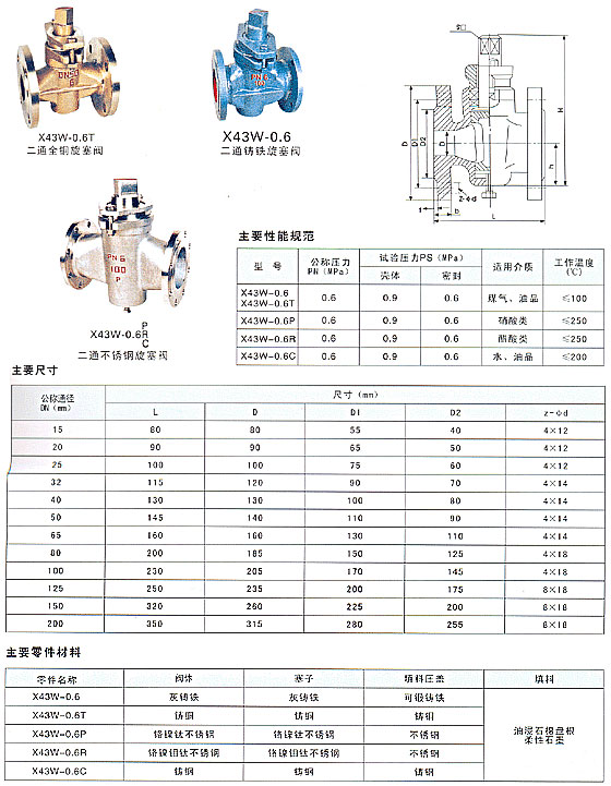 X43W二通全銅-鑄鐵-不銹鋼旋塞閥,主要性能規范: 型號 公稱壓力 (MPa) 試驗壓力PS(MPa) 適用介質 工作溫度(℃) 殼體 密封 X43W-10 1.0 1.5 1.1 煤氣、油品 ≤100 主要零件材料: 零件名稱 閥體 塞子 填料壓蓋 填料 X43W-10 鑄鐵 鑄鐵 鑄鐵 油浸石棉盤根 柔性石墨