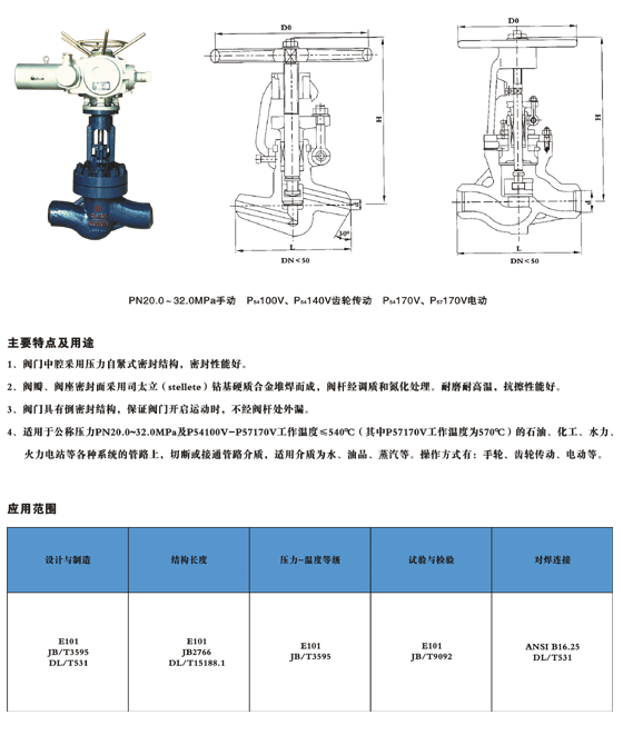電站截止閥適用于公稱壓力PN20~32MPa及P54/100V-P57/170V ,工作溫度≤540℃(其中P57/170V工作溫度為570℃)的石油、化工 、水力 、火力電站各種系統的管路中,切斷或接通管路介質