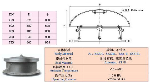 緊急放空人孔(呼吸人孔)是是安裝在石油化工等儲罐上的安全應急通風裝置,通常與同一罐頂上安裝的呼吸閥配套使用,維持罐內的正常壓力,既能避免因意外原因造成罐內急劇超壓或真空時,損壞儲罐而發生的事故;具有定壓排放、定壓吸入、式閉靈活、安全阻火、結構緊湊、密封性能好、安全可靠等優點。 主要技術參數: 1、工作壓力:呼出:+1961.2(200mmH 2 O) 吸入:-392.2(-40mmH 2 O) 2、溫度范圍:-30 -60℃ 3、吸入面積: 0.043116M 2 4、型 號:DN500 (¢705×H380) DN600 (¢805×H480)